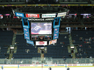 We experienced our first NHL game while in Columbus. (I promise, this is my last post about our ventures in Ohio). The day didn't start out great when my purse strap broke. I obviously didn't bring a spare on our 2 day get-away. What was I thinking? I guess I should always be prepared (especially now that Blake is into scouting....isn't that the motto, after all?)! Anyway, my purse broke so I looked like a pretty big dork. Then my camera broke after the teams started warming up. So I'm sorry to say I don't have many pictures to post (I know most of you are doing silent...or very loud cheers)!!!!
